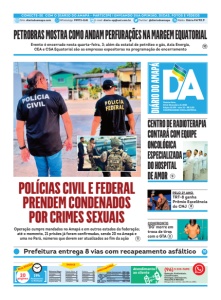POLÍCIAS CIVIL E FEDERAL PRENDEM CONDENADOS POR CRIMES SEXUAIS Quinta-feira, 04 de Dezembro de 2025 Edição 10.199 - Ano 32 - R$ 2,00 COMPROMISSO COMA NOTÍCIA CENTRO DE RADIOTERAPIA CONTARÁ COM EQUIPE ONCOLÓGICA ESPECIALIZADA DO HOSPITAL DE AMOR PELO 2º ANO TRT-8 ganha Prêmio Excelência do CNJ 8 CONFRONTO ‘DG’ morre em troca de tiros com o GTA 11 CONECTE-SE COM O DIÁRIO DO AMAPÁ - PARTICIPE ! ENVIANDO SUA OPINIÃO, DICAS, FOTOS E VÍDEOS Site: diariodoamapa.com WhatsApp: 99972-1141 E-mail: diario-ap@uol.com.br Twitter: @diariodoamapa Rádio: Diário FM 90.9 Operação cumpre mandados no Amapá e em outros estados da federação; até o momento, 21 prisões já foram confirmadas, sendo 20 no Amapá e uma no Pará, números que devem ser atualizados ao fim da ação 11 Redação, Publicidade, Classificados, Entregas, Assinaturas, MACAPÁ E REGIÃO (Segunda a sexta, das 8h às 18h) 19h Fechamento na Redação ÍNDICE INDICADORES Atendimento ao cliente Dólar Comercial R$ 5,66 Dólar Turismo R$ 5,89 Euro R$ 6,32 Poupança 3,325% Salário Minimo R$ 1,518 20 páginas ESTA EDIÇÃO (96) 3 223-7690 Editoria/Pags. Artigos 2 From 3 Argumento 4 Esplanada 5 Paulo Silva 6 Economia 7 Politíca 8 Cidades 9 Cidades 10 Polícia 11 Esportes 12 Nota10 14 Heraldo 15 Social 16 10 PETROBRAS MOSTRA COMO ANDAM PERFURAÇÕES NA MARGEM EQUATORIAL Evento é encerrado nesta quarta-feira, 3; além da estatal de petróleo e gás, Axia Energia, CEA e CSA Equatorial são as empresas expositoras na programação de encerramento Prefeitura entrega 8 vias com recapeamento asfáltico 10 9