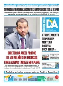 DIRETOR DA ANEEL PROPÕE R$ 400 MILHÕES DE RECURSOS PARA ALIVIAR TARIFAS NO AMAPÁ Quinta-feira, 29 de Janeiro de 2026 Edição 10.239 - Ano 32 - R$ 2,00 COMPROMISSO COMA NOTÍCIA ATROPELAMENTO TERMINA EM MORTE NA RODOVIA DUCA SERRA POLÍTICAS PÚBLICAS Rota do Pescado no Amapá ganha reforço com microcrédito 8 SUCESSO Programa Zera Fila ultrapassa 10,3 mil cirurgias realizadas no Amapá CONECTE-SE COM O DIÁRIO DO AMAPÁ - PARTICIPE ! ENVIANDO SUA OPINIÃO, DICAS, FOTOS E VÍDEOS Site: diariodoamapa.com WhatsApp: 99972-1141 E-mail: diario-ap@uol.com.br Twitter: @diariodoamapa Rádio: Diário FM 90.9 Voto de Fernando Mosna introduz critério socioeconômico no rateio de royalties de hidrelétricas e pode multiplicar por mais de dez os recursos destinados à modicidade tarifária da CEA 8 Redação, Publicidade, Classificados, Entregas, Assinaturas, MACAPÁ E REGIÃO (Segunda a sexta, das 8h às 18h) 19h Fechamento na Redação ÍNDICE INDICADORES Atendimento ao cliente Dólar Comercial R$ 5,20 Dólar Turismo R$ 5,41 Euro R$ 6,21 Poupança 3,325% Salário Minimo R$ 1,621 20 páginas ESTA EDIÇÃO (96) 3084-2216 Editoria/Pags. Artigos 2 From 3 Argumento 4 Esplanada 5 Paulo Silva 6 Economia 7 Politíca 8 Cidades 9 Cidades 10 Polícia 11 Esportes 12 Nota10 14 Heraldo 15 Social 16 GOVERNO GARANTE ARQUIBANCADAS GRATUITAS PARA DESFILES DAS ESCOLAS DE SAMBA Governador Clécio e senador Davi Alcolumbre anunciam entrada franca para o público acompanhar apresentações das 10 agremiações nos dias 13 e 14 de fevereiro Prefeitura divulga programação do Festival Esportivo 12 11 9 14