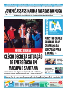 CLÉCIO DECRETA SITUAÇÃO DE EMERGÊNCIA EM MACAPÁ E SANTANA Domingo e Segunda-feira, 22 e 23 de Março de 2026 Edição 10.277 - Ano 32 - R$ 2,00 COMPROMISSO COMA NOTÍCIA MINISTRO CAMILO SANTANA TRAZ CARAVANA DA EDUCAÇÃO PARA O AMAPÁ REAJUSTE DaLua recebe comissão de professores 12 “REENVOLVER” Rafael Senra lança clipe Primeiro de Abril 17 CONECTE-SE COM O DIÁRIO DO AMAPÁ - PARTICIPE ! ENVIANDO SUA OPINIÃO, DICAS, FOTOS E VÍDEOS Site: diariodoamapa.com WhatsApp: 99972-1141 E-mail: diario-ap@uol.com.br Twitter: @diariodoamapa Rádio: Diário FM 90.9 Gestor visitou as áreas alagadas e acompanhou de perto o trabalho da Defesa Civil Estadual, responsável por coordenar a missão emergencial 11 Redação, Publicidade, Classificados, Entregas, Assinaturas, MACAPÁ E REGIÃO (Segunda a sexta, das 8h às 18h) 19h Fechamento na Redação ÍNDICE INDICADORES Atendimento ao cliente Dólar Comercial R$ 5,66 Dólar Turismo R$ 5,89 Euro R$ 6,32 Poupança 3,325% Salário Minimo R$ 1,621 24 páginas ESTA EDIÇÃO (96) 3084-2216 Editoria/Pags. Artigos 2 From 3 Argumento 4 Esplanada 5 Paulo Silva 6 Economia 7 Politíca 9 Cidades 11 Cidades 12 Polícia 15 Esportes 16 Nota10 17 Heraldo 19 Social 20 JOVEM É ASSASSINADO A FACADAS NO MUCA ‘Digão’ teria entrado correndo em uma área de pontes no fim da avenida Guaranis, já ferido; dois homens armados com arma branca foram vistos por populares deixando o local Jennyfer é convocada para seleção brasileira juvenil de handebol 16 9 FORTES CHUVAS 15